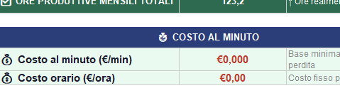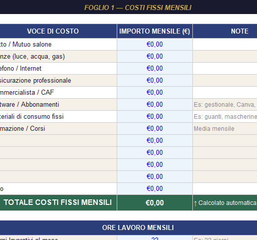 - Foglio 1 — Costi Fissi: inserisci le tue spese mensili (affitto, bollette, abbonamenti). Il calcolatore ricava automaticamente il tuo costo al minuto