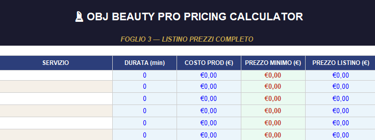 - Foglio 3 — Listino Prezzi: costruisci il tuo listino completo, con prezzi coerenti e sostenibili